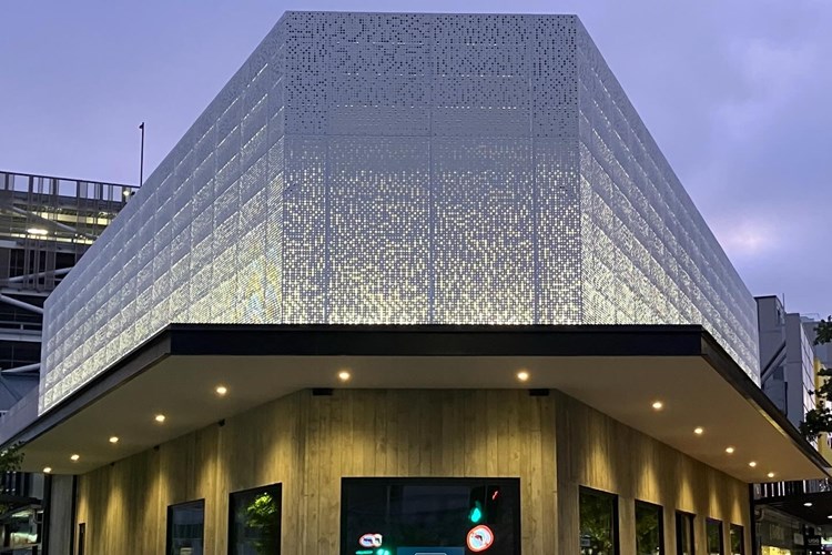 These large-format flat perforated aluminium panels, finished in a matt white powder coat, feature a five-hole “Effervescence” pattern with 15% open area. They provide decorative screening for the precast concrete structure, creating an attractive façade that comes alive at night through back-lit illumination.