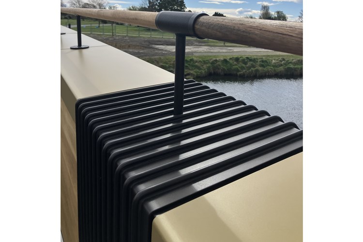 More than 100 golden perforated aluminium panels represent bundled raupō reeds, while the 40 dark bronze steel panels symbolise the flax bindings that hold them together. The timber guardrails are mounted with over 60 steel upstands.