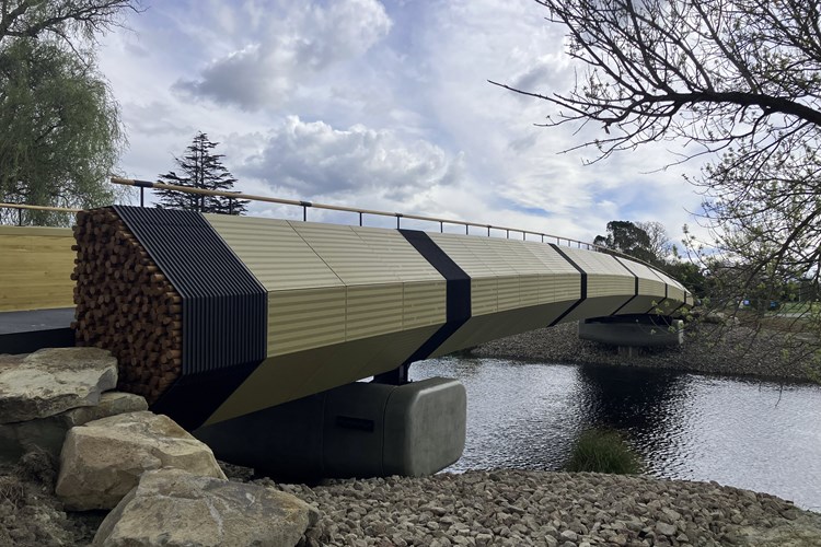 This unique walking bridge draws on concepts developed by engineering and fine arts students at the University of Canterbury and is inspired by Mōkihi, the small canoe-like vessels traditionally made from raupō and flax.